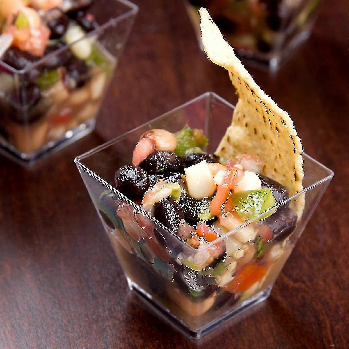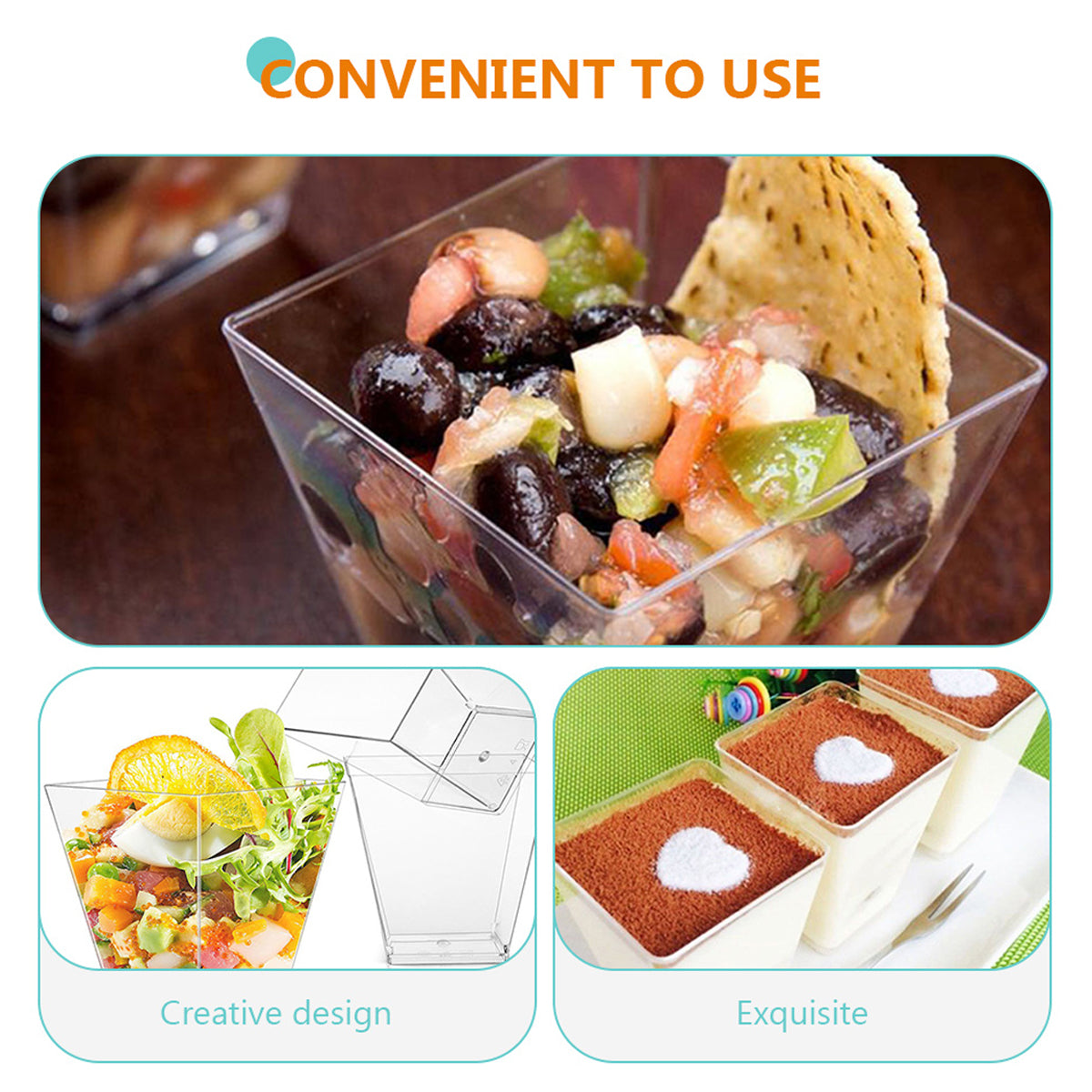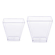 The square tapered design creates a modern presentation format suitable for mousse, yogurt parfaits, puddings, fruit desserts, salads, and other small servings. The transparent material allows chefs, caterers, and home bakers to display layered textures and colours clearly for attractive food presentation.