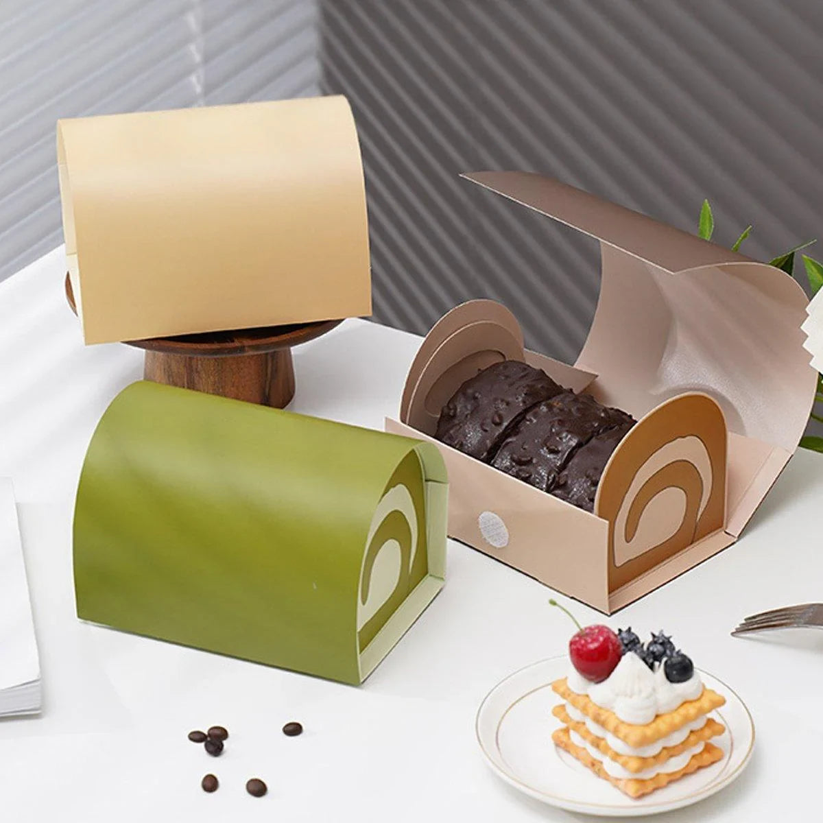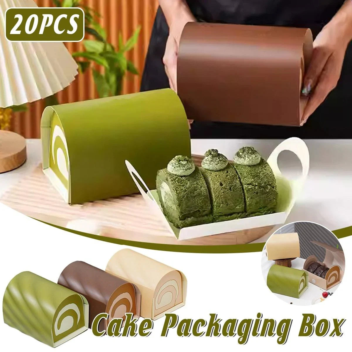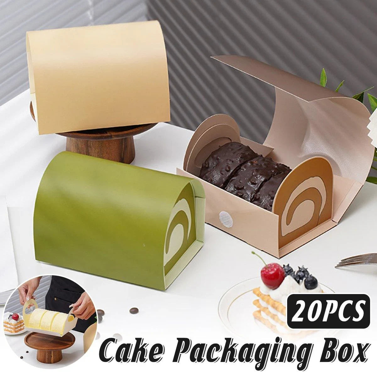 Present your delicious baked goods in style with our set of 20 Baking Boxes, specially designed for cake rolls, Swiss rolls, mousse pastries, and towel rolls. Crafted from high-quality food-grade cardboard, these elegant and practical boxes ensure durability and a professional appearance. The unique curved top design adds sophistication and allows for easy access to the contents. Available in three colors—brown, green, and beige—these boxes are perfect for enhancing any bakery display or special occasion. Ideal for home bakers, bakery shops, parties, weddings, and other events, they keep your creations fresh and beautifully presented.