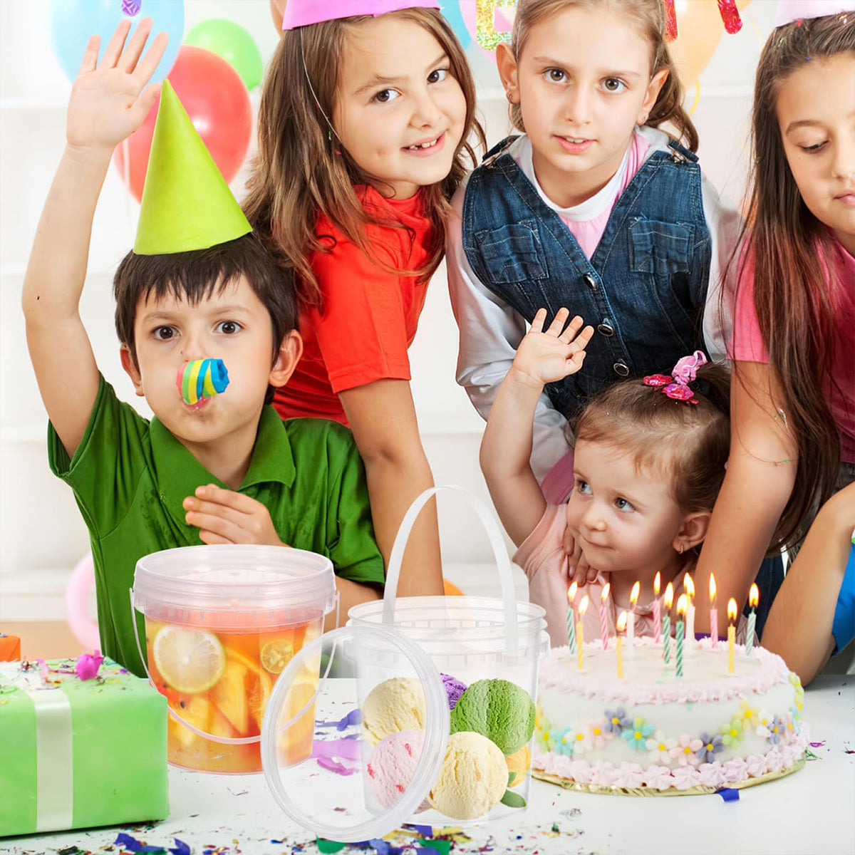 Each container includes a secure screw-on lid and an integrated handle for convenient handling and transportation. The transparent design supports organised storage while maintaining product visibility for preparation, packing, and display. Suitable for storing a variety of food items including fruits, liquids, and dry ingredients, these containers support efficient storage workflows in kitchens, pantries, takeaway preparation areas, and food packaging environments.