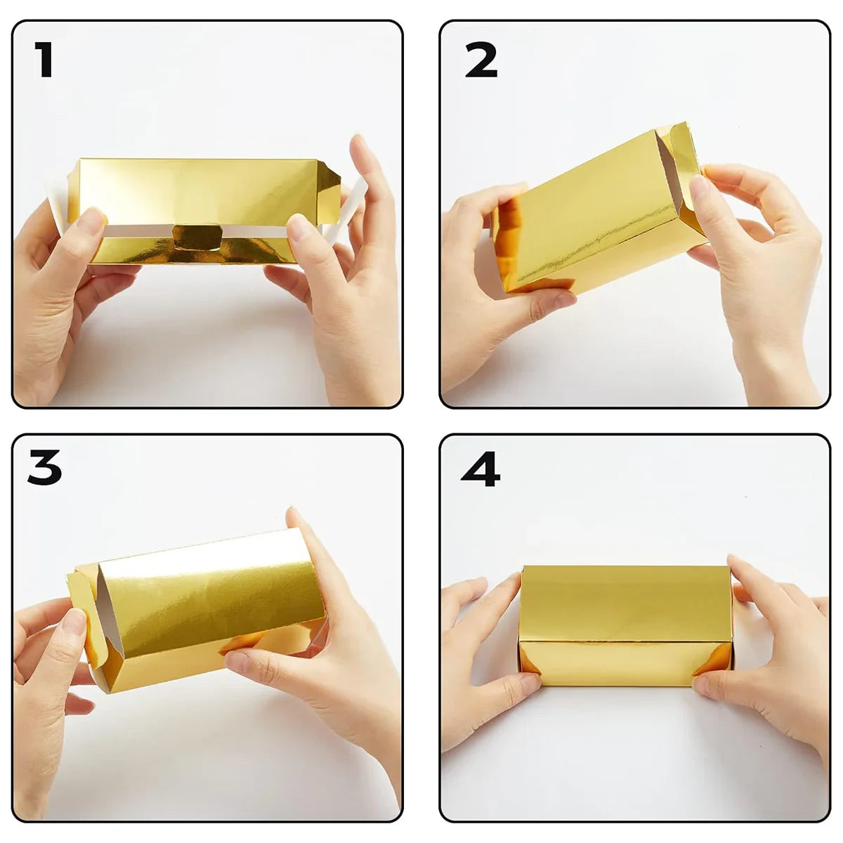 These elegant and durable gold chocolate boxes are perfect for various occasions, such as parties, weddings, or special celebrations. Designed to hold candies, chocolates, or small gifts, they add a touch of sophistication and charm to your events. The boxes are easy to assemble and made from high-quality materials, ensuring they look great and hold up well.