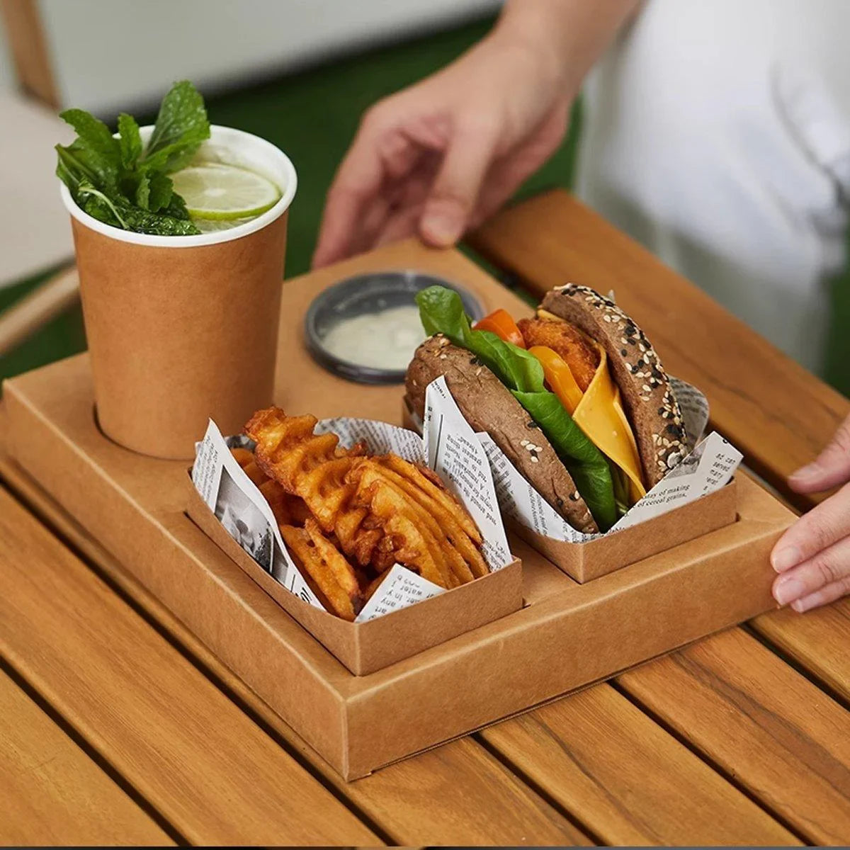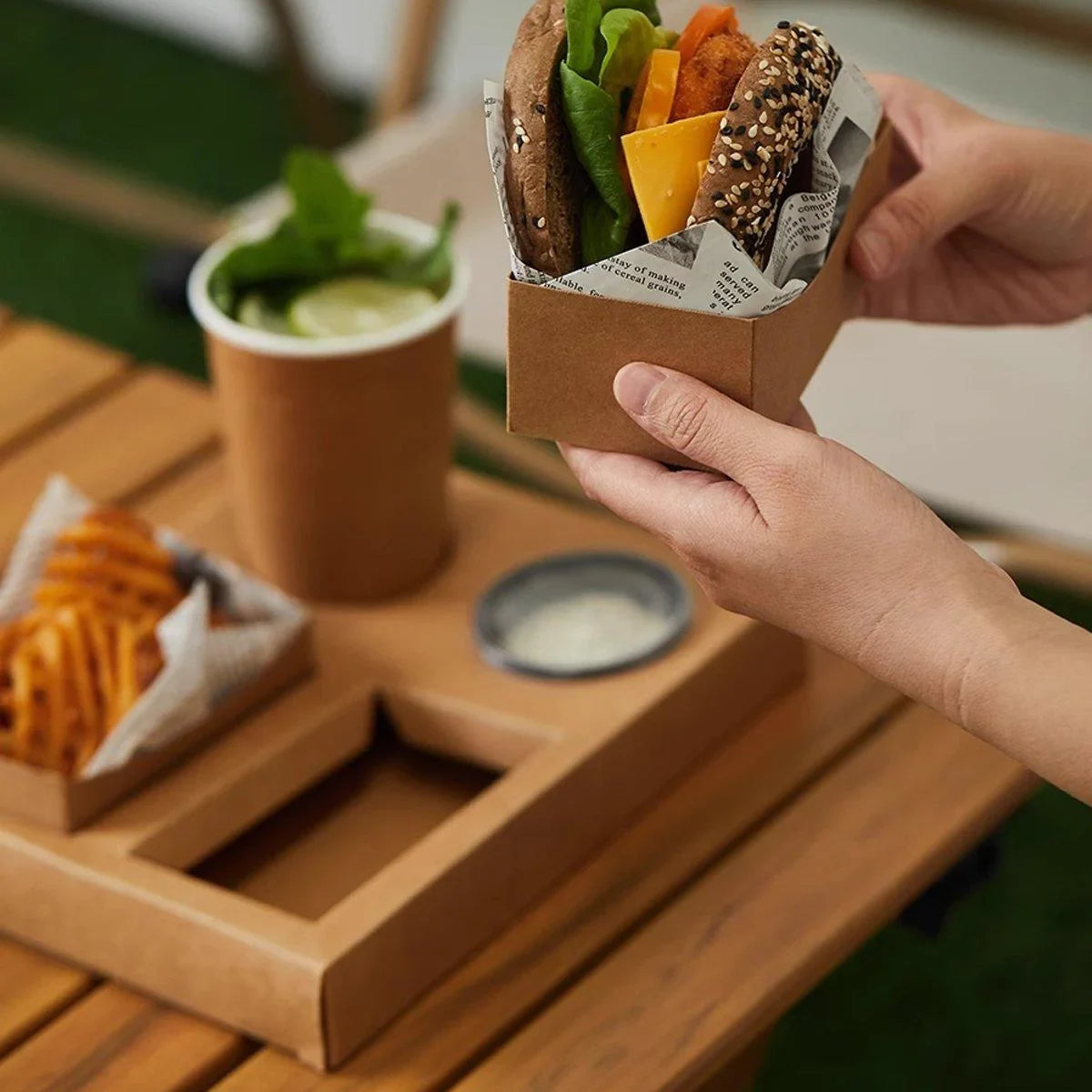 This versatile Kraft Paper Lunch Box Set is perfect for serving meals like hamburgers, sandwiches, and snacks. Made from eco-friendly kraft paper, these boxes are ideal for picnics, parties, and take-out services. They provide a practical and stylish way to present food, featuring compartments to keep meals neatly organized. Each box is designed for durability and includes an internal coating that resists oil and water, ensuring your food stays fresh and mess-free.
