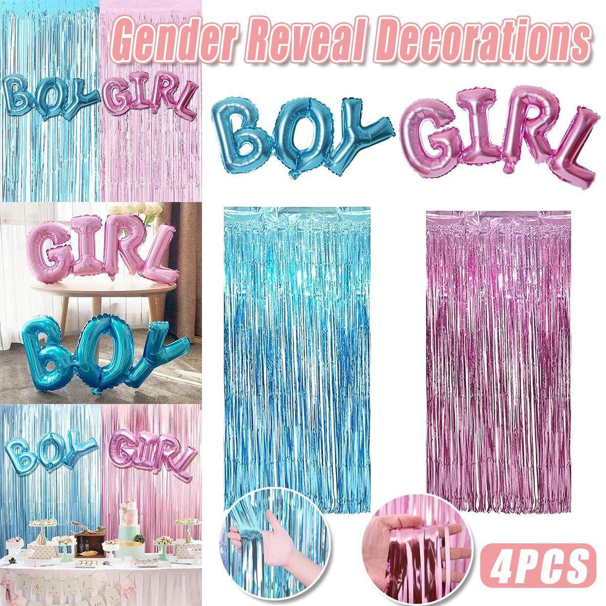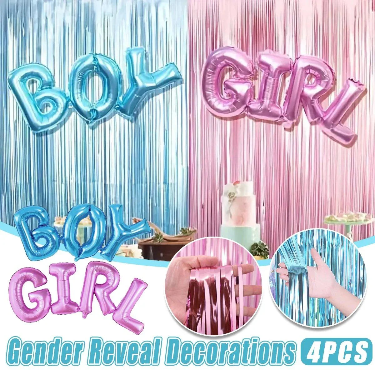 Add a special touch to your baby gender reveal party with this eye-catching set of balloon and silk curtain decorations. Featuring shiny blue "BOY" and pink "GIRL" letter balloons, along with matching metallic fringe curtains, this set creates a memorable backdrop for photos and celebrations. The balloons are made from durable material, easy to inflate, and perfect for hanging or floating when filled with helium. The high-quality metallic foil curtains ensure a vibrant and reflective effect, bringing your party to life. Ideal for gender reveal parties, baby showers, or any celebration!