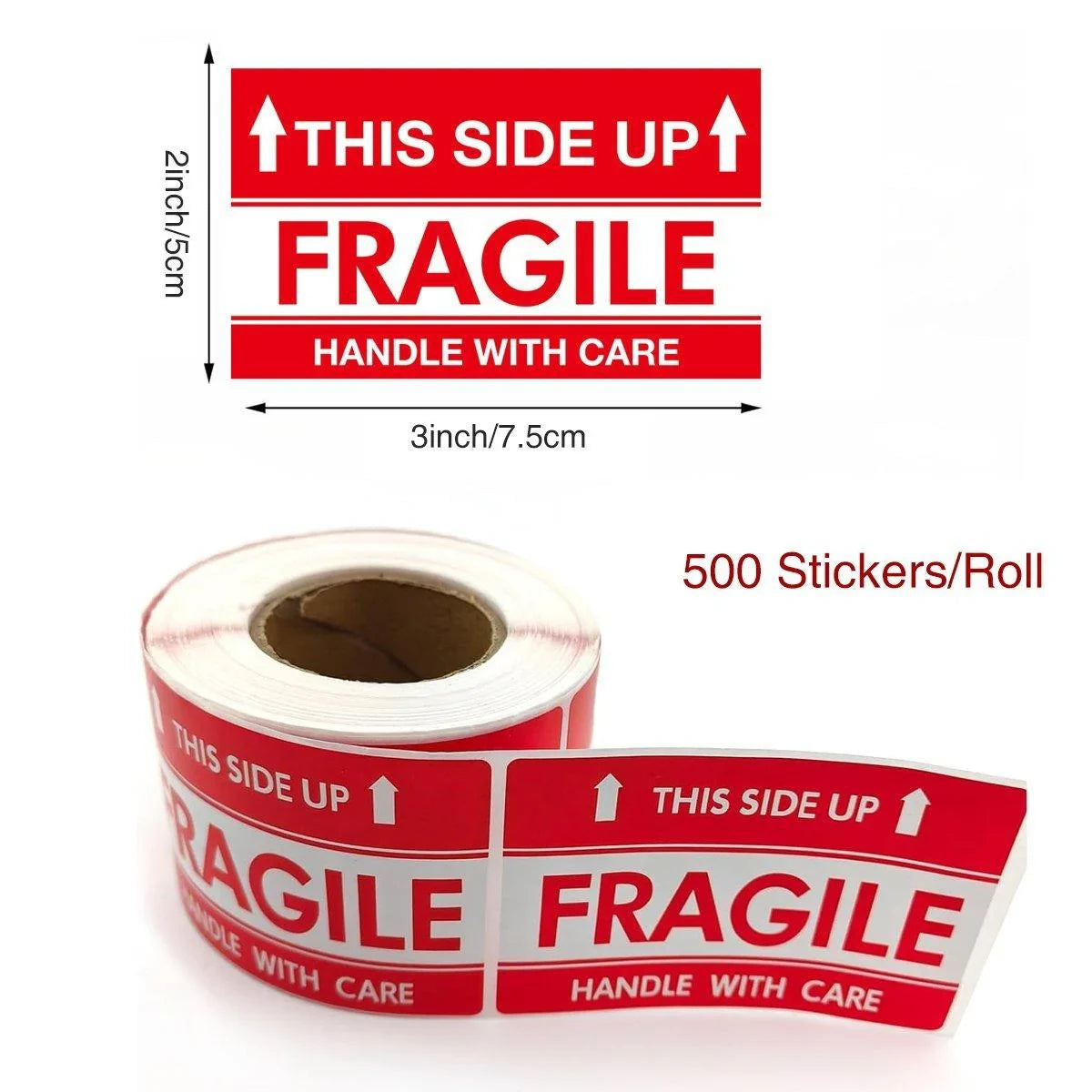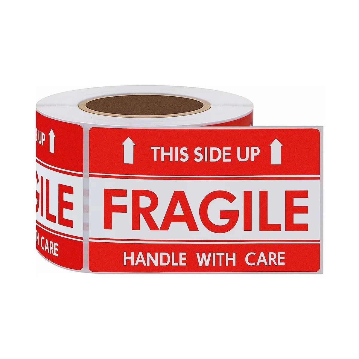 Ensure safe handling of your fragile items with this roll of 500 waterproof "Fragile" stickers. Each 3 x 2-inch label features bold red and white text, with clear warnings such as "Fragile," "Handle with Care," and "This Side Up." The high-visibility design and strong adhesive backing make these labels perfect for shipping, packaging, and handling fragile goods. Waterproof and durable, these stickers stay intact even in humid conditions.