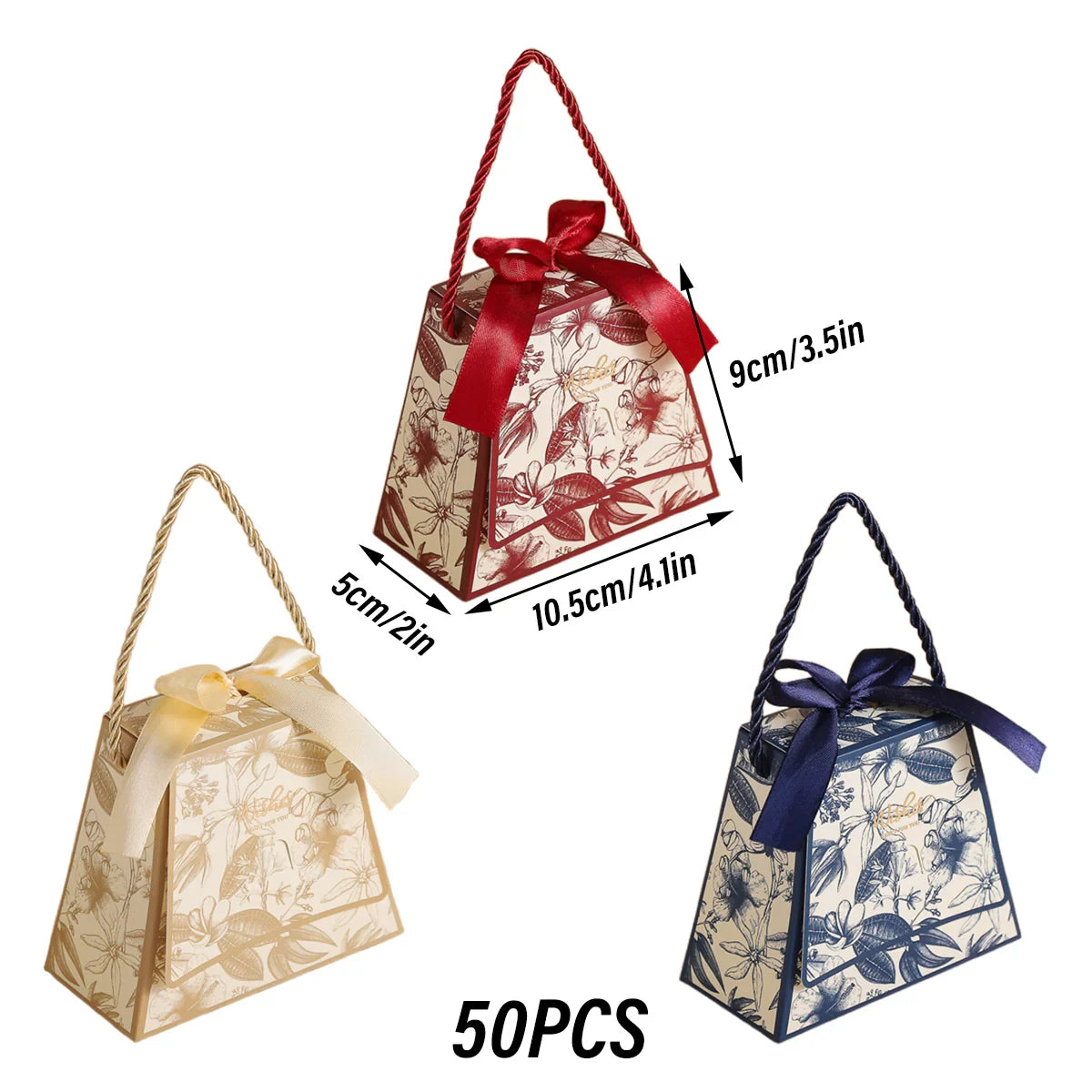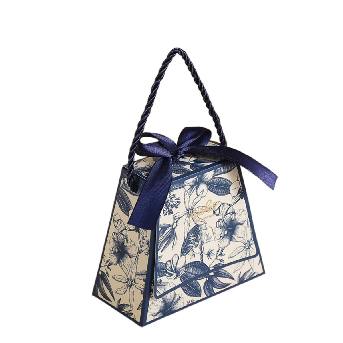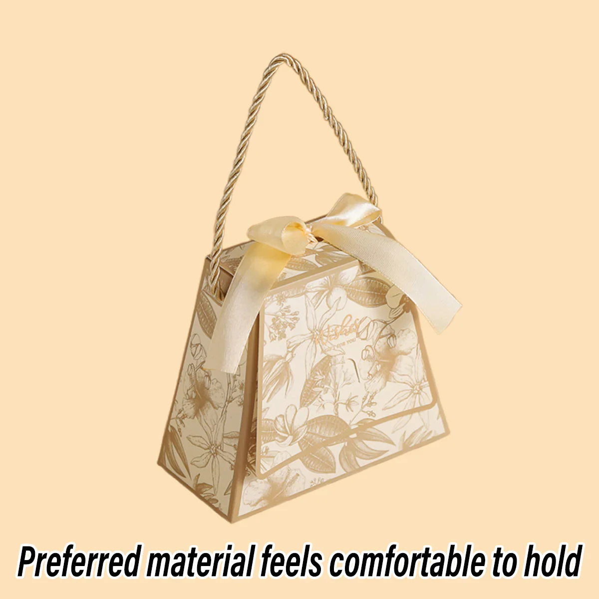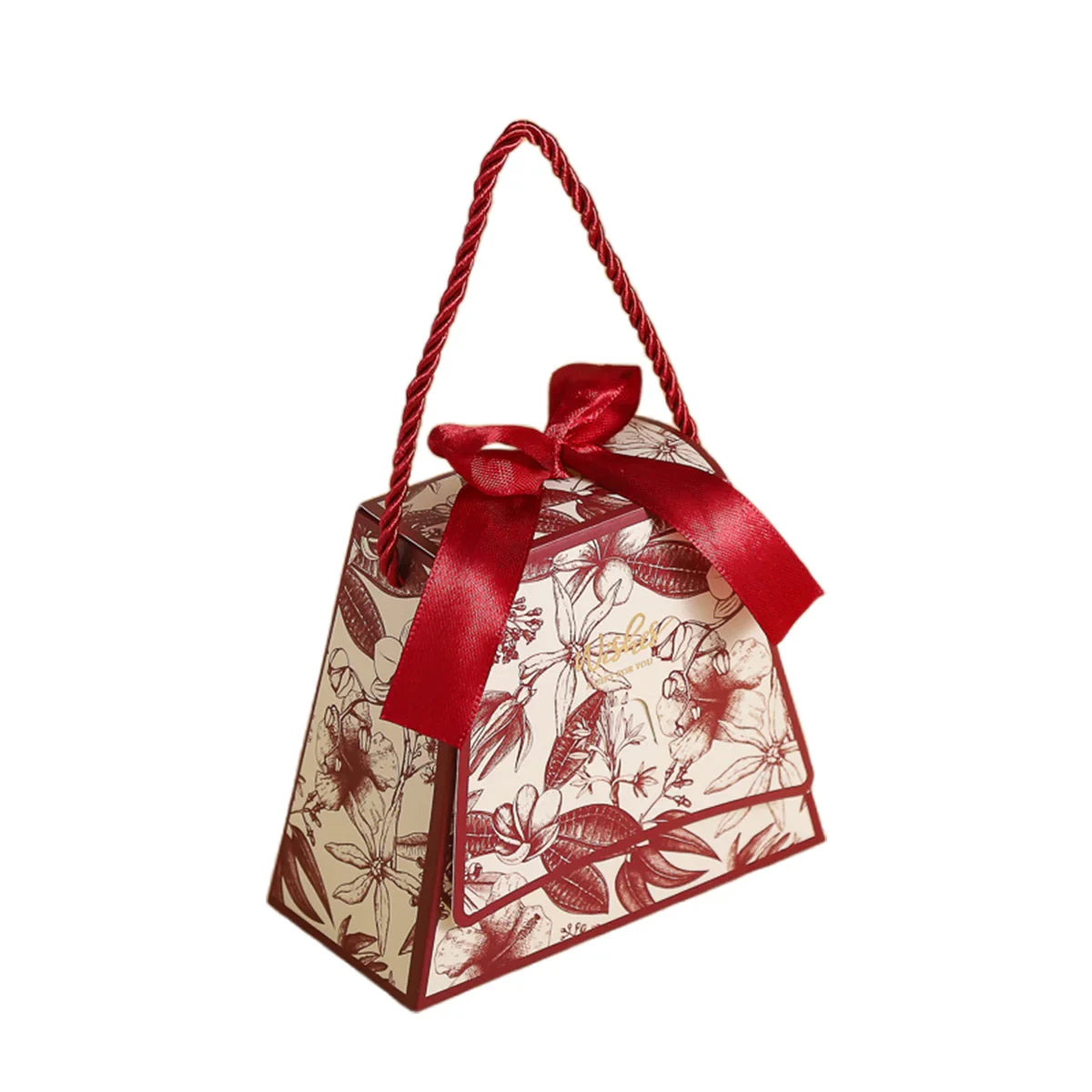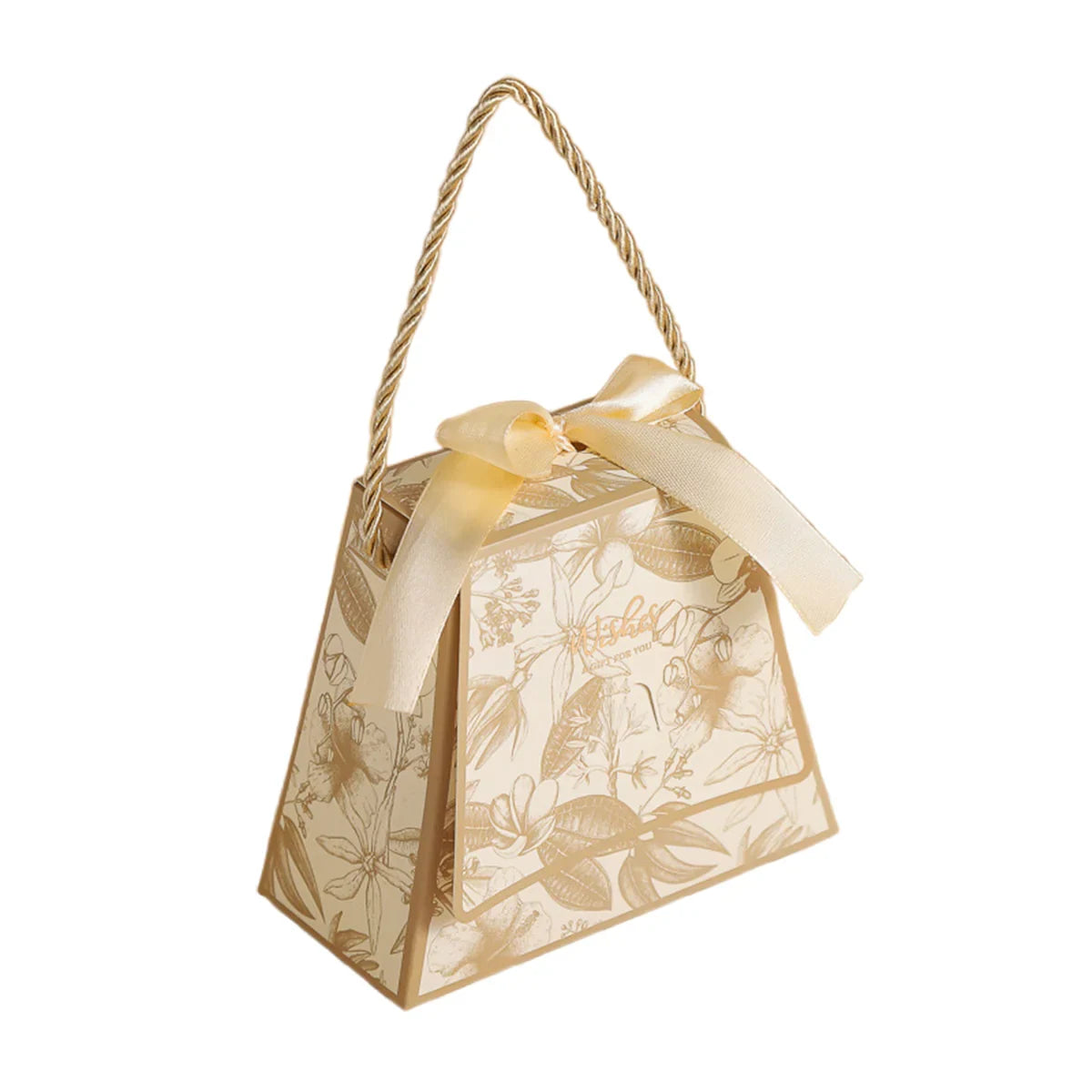 Enhance your special occasions with these elegant wedding candy gift boxes. Designed with a stylish handbag shape and decorated with a delicate floral print, these boxes are ideal for holding chocolates, sweets, and small gifts. Crafted from high-quality, durable cardstock, they add a luxurious touch to weddings, parties, and celebrations. Featuring a built-in ribbon and sturdy rope handle, they provide a secure and elegant way to present your treats. These boxes arrive flat-packed for easy storage and require simple assembly.