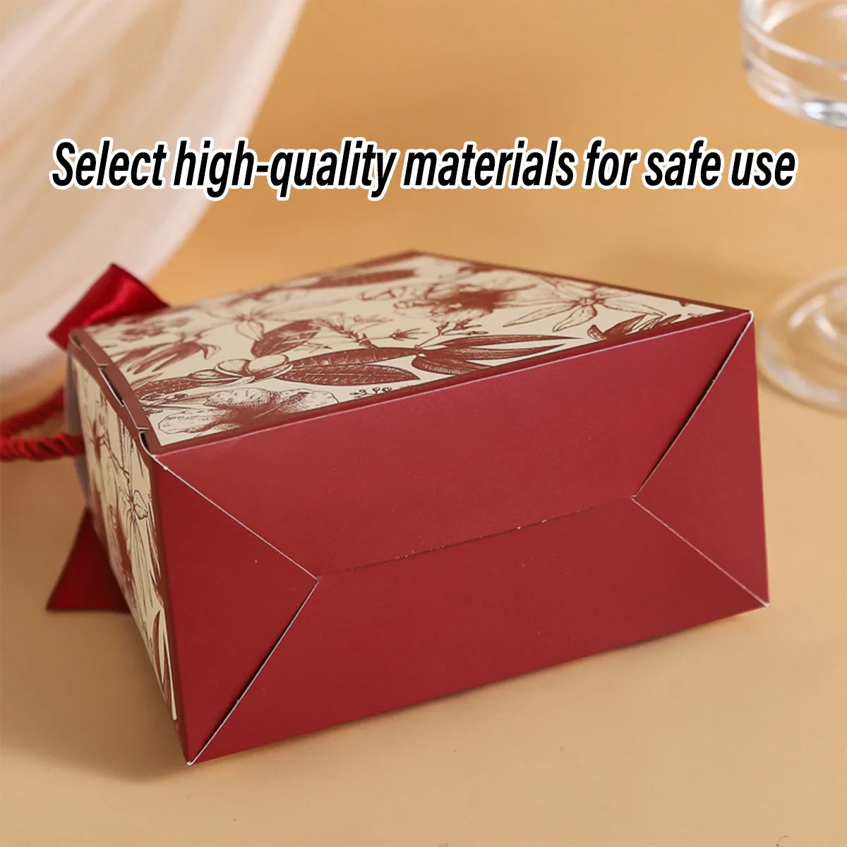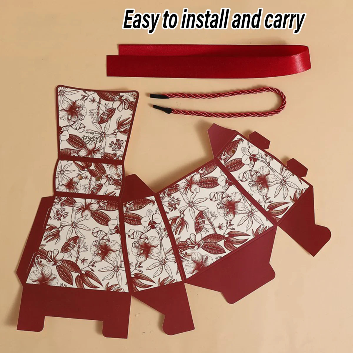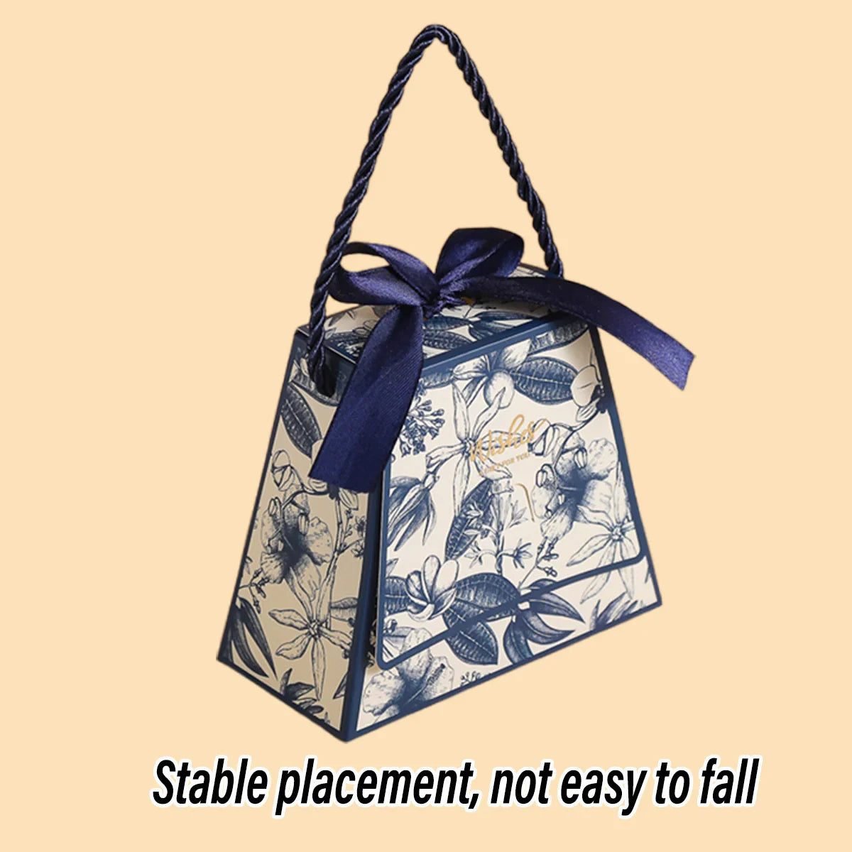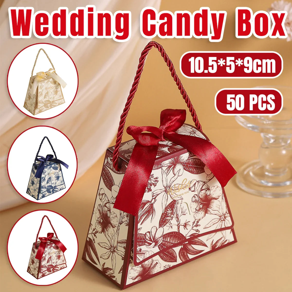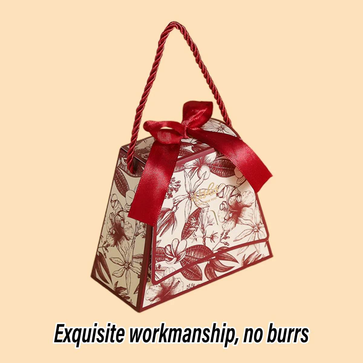 Enhance your special occasions with these elegant wedding candy gift boxes. Designed with a stylish handbag shape and decorated with a delicate floral print, these boxes are ideal for holding chocolates, sweets, and small gifts. Crafted from high-quality, durable cardstock, they add a luxurious touch to weddings, parties, and celebrations. Featuring a built-in ribbon and sturdy rope handle, they provide a secure and elegant way to present your treats. These boxes arrive flat-packed for easy storage and require simple assembly.