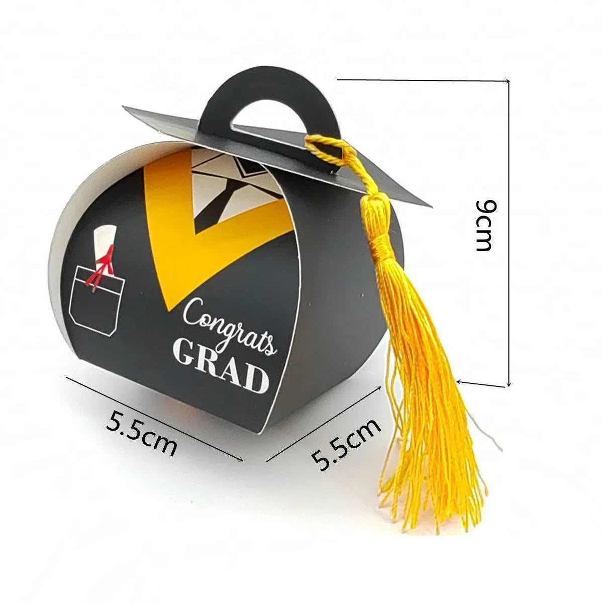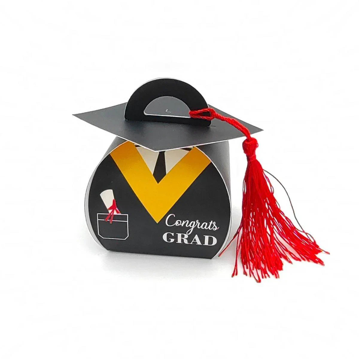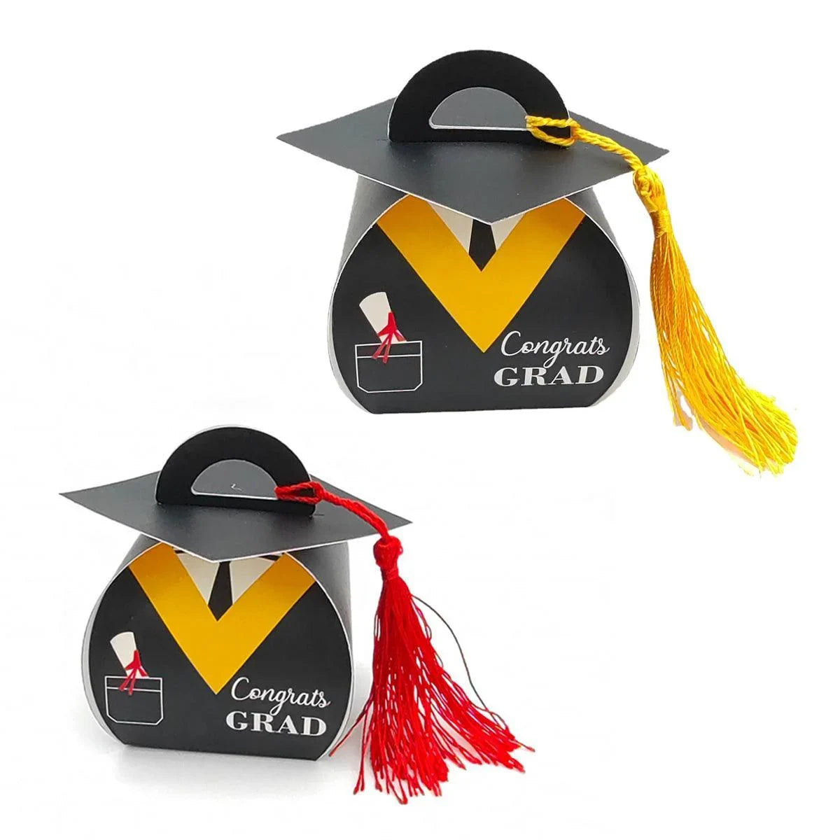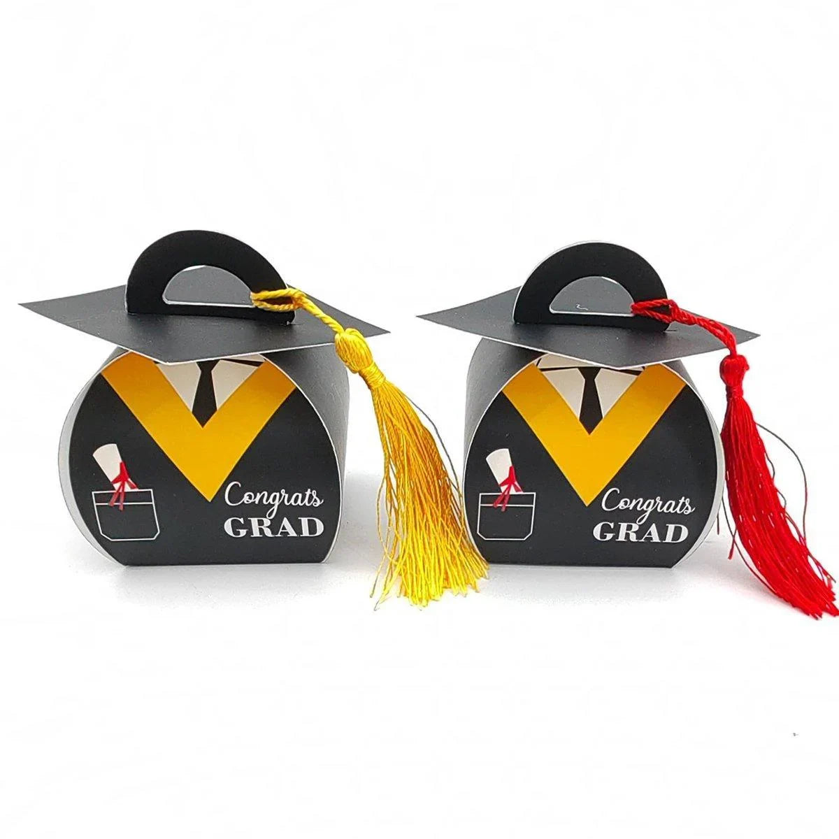 Bachelor Gown Gift Box crafted from high-quality white card printing with elegant tassels, perfect for holding candies and small gifts. This set includes 50PCS of stylish gift boxes in yellow and red. Ideal for graduation celebrations, these bachelor gown gift boxes add a touch of sophistication to any event, making them perfect for gifting.