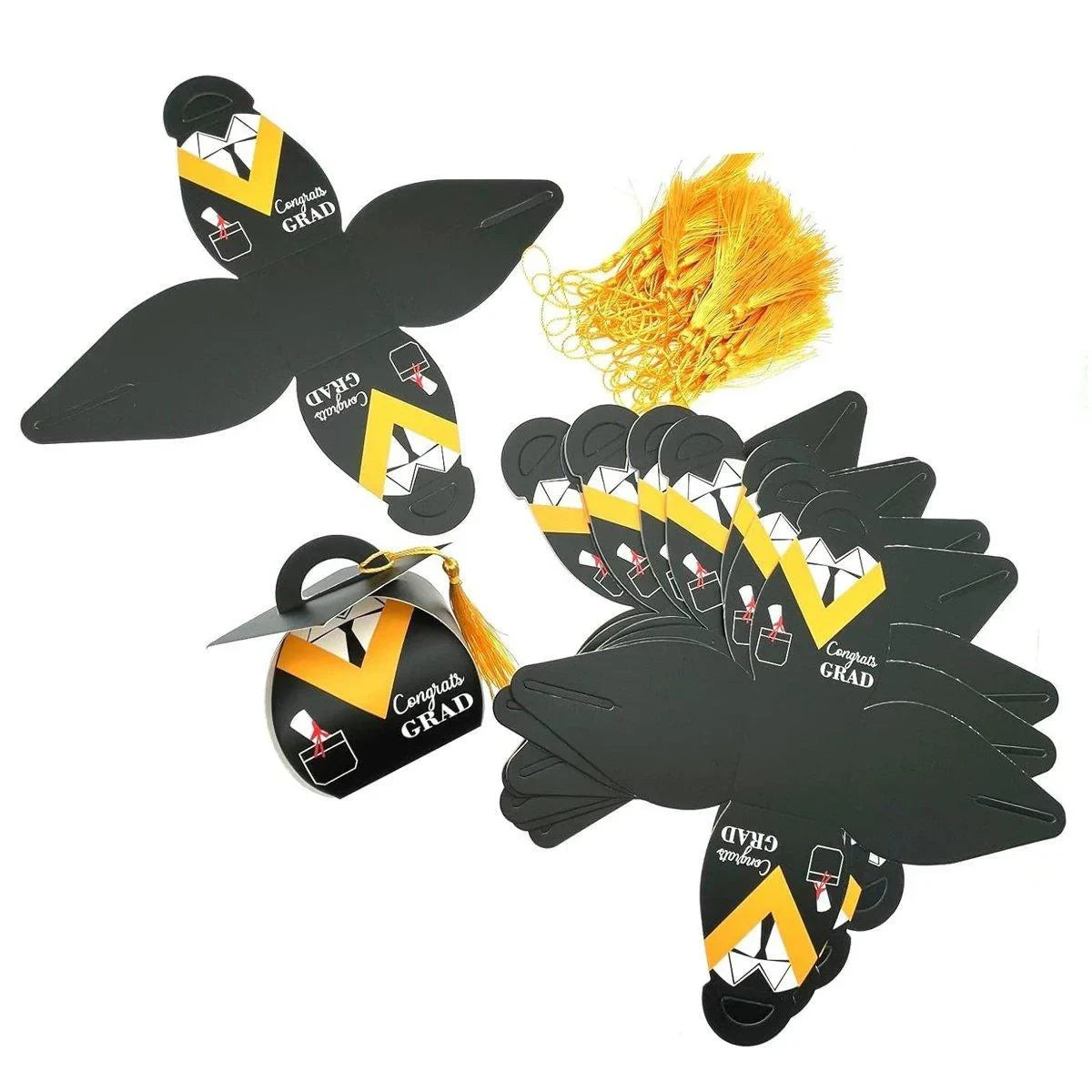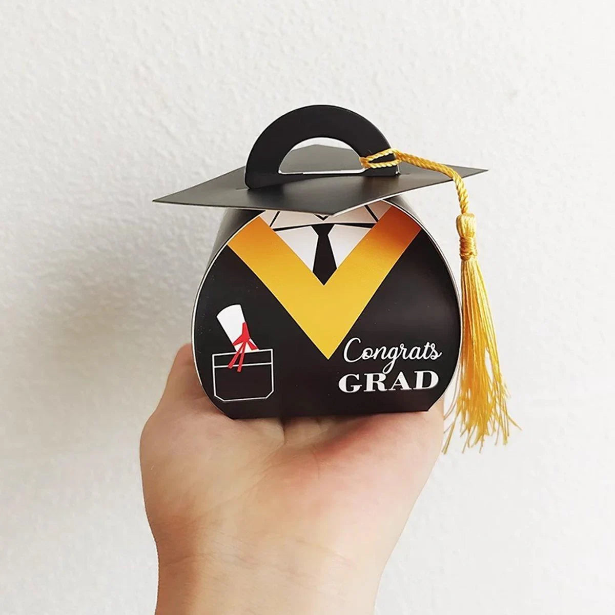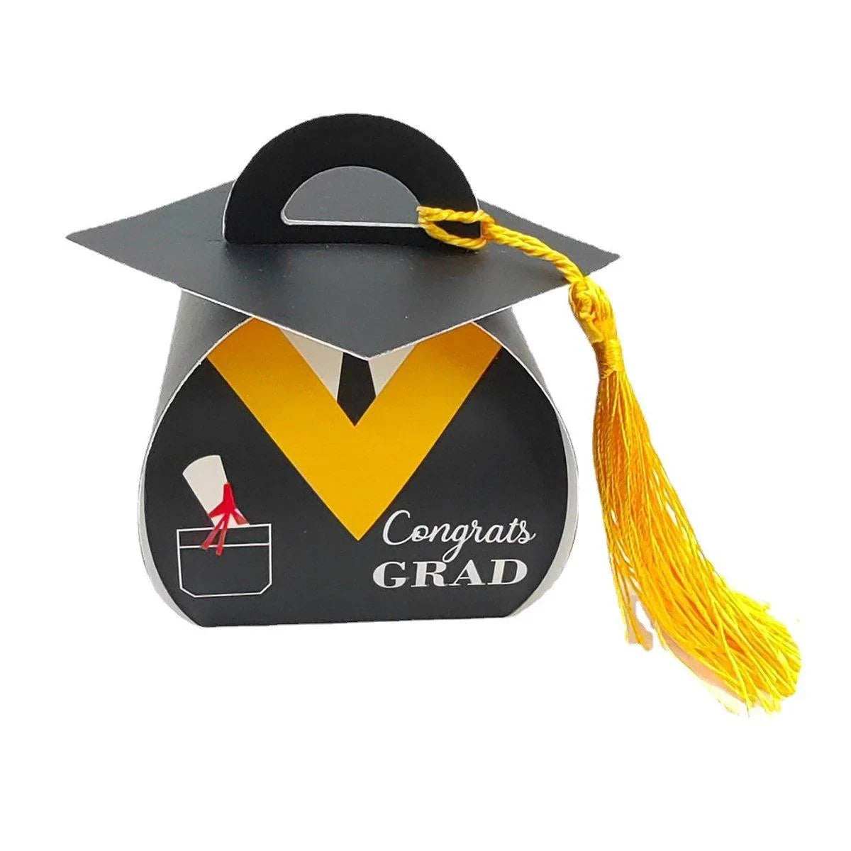Bachelor Gown Gift Box crafted from high-quality white card printing with elegant tassels, perfect for holding candies and small gifts. This set includes 50PCS of stylish gift boxes in yellow and red. Ideal for graduation celebrations, these bachelor gown gift boxes add a touch of sophistication to any event, making them perfect for gifting.