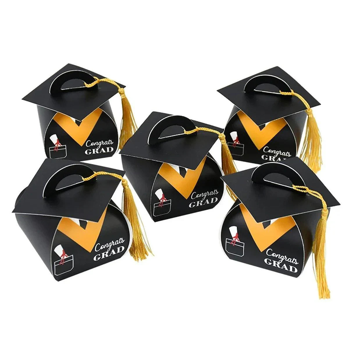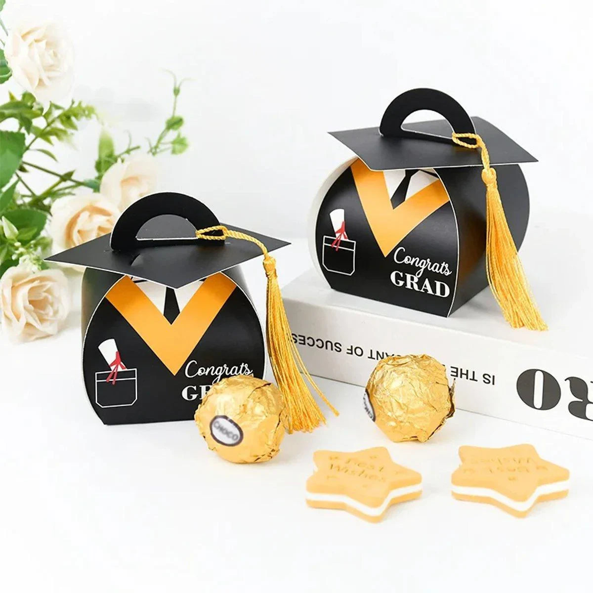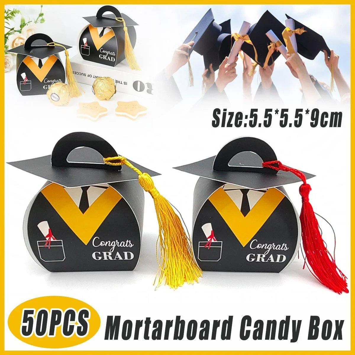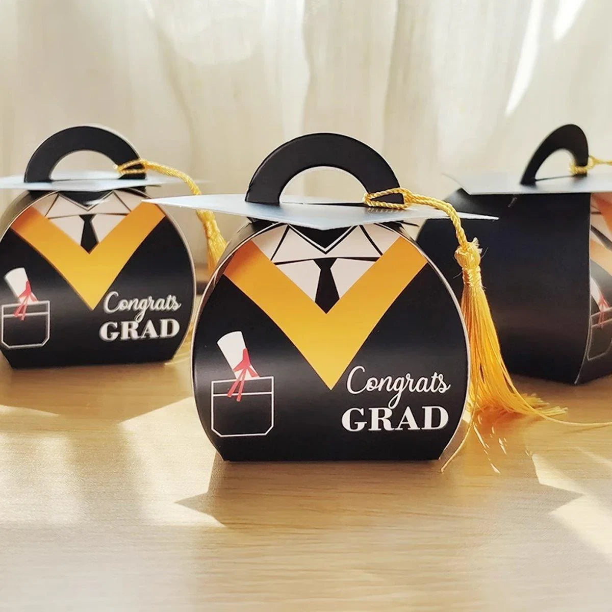 Bachelor Gown Gift Box crafted from high-quality white card printing with elegant tassels, perfect for holding candies and small gifts. This set includes 50PCS of stylish gift boxes in yellow and red. Ideal for graduation celebrations, these bachelor gown gift boxes add a touch of sophistication to any event, making them perfect for gifting.