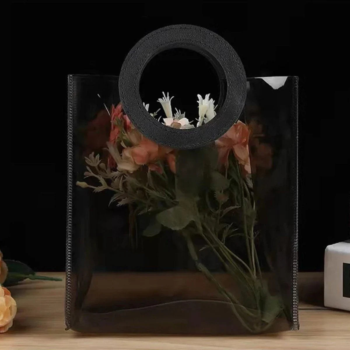 Black PVC Jelly Bag adds a touch of sophistication to your gifts. Featuring both round and square handles, these gift bags are perfect for any occasion. Made from durable PVC material, these black PVC jelly bags are stylish and practical. Ideal for florists, gift shops, and personal use, these handbags can be used for flowers, gifts, or other special items.