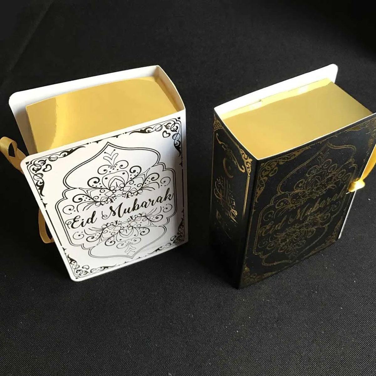 Eid Mubarak Book Shaped Gift Box introduces a touch of elegance to your festivities. Crafted from durable 300g white card and enhanced with exquisite hot stamping, these gift boxes are perfect for holiday parties, weddings, or any special event where style is key. Available in classic white and sleek black, these book shaped gift boxes are ideal for packaging candies, small gifts, or as decorative party favors.