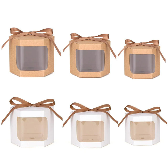 These elegant small gift boxes are perfect for packaging treats, jewellery, or small gifts. Featuring a stylish hexagonal design with a transparent window, these boxes allow for a beautiful display of contents. Crafted from thick kraft paper with a decorative ribbon, they add a touch of sophistication to any occasion. Easy to assemble and durable, they provide a secure and charming way to present gifts for parties, weddings, or other special events.