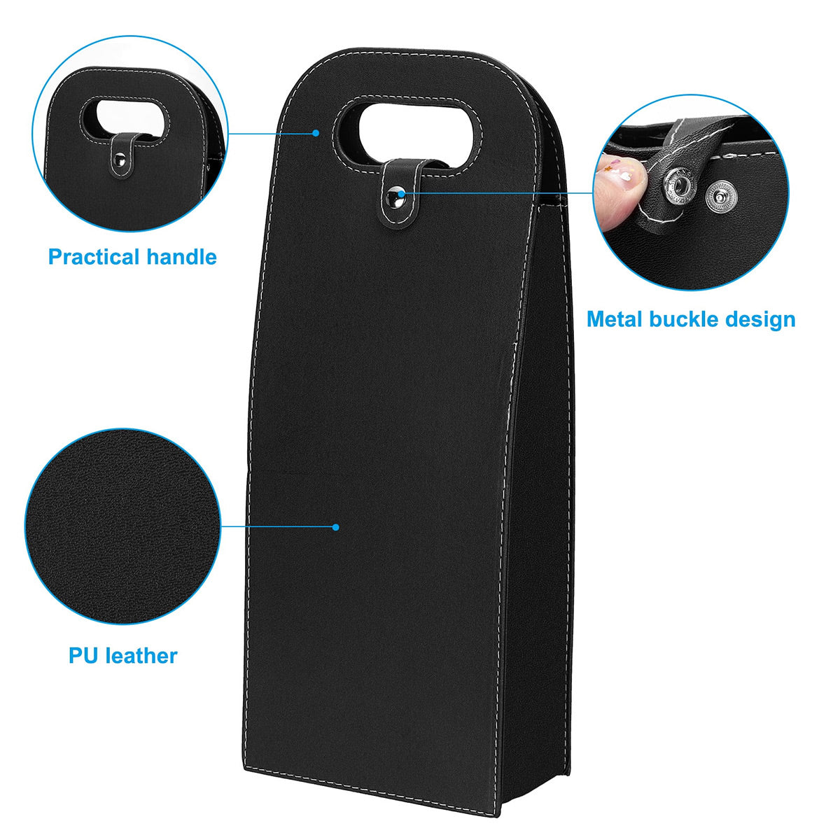 Each tote bag includes a durable carry handle, a metal buckle closure, and reinforced bottom padding to help protect bottles during handling and short-distance transport. The PU leather exterior offers a clean and durable surface while maintaining a lightweight structure. Suitable for standard 750ml wine bottles, champagne, and beer bottles, the bag is appropriate for retail wine packaging, promotional events, corporate gifting, and hospitality service environments.