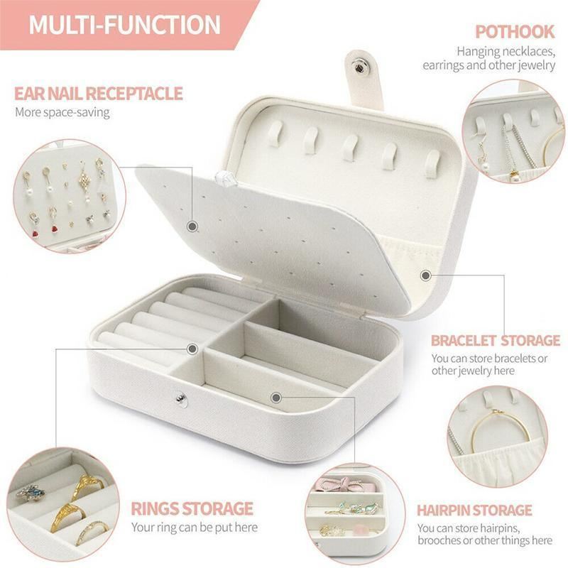 - High Capacity: Features 7 ring rolls, compartments for bracelets, and can hold up to 10 pairs of earrings.