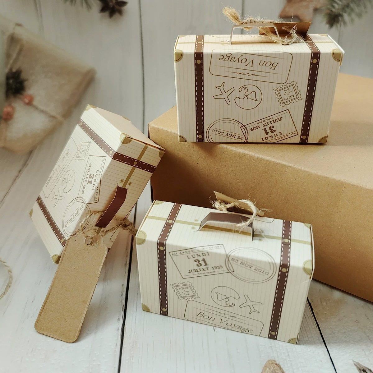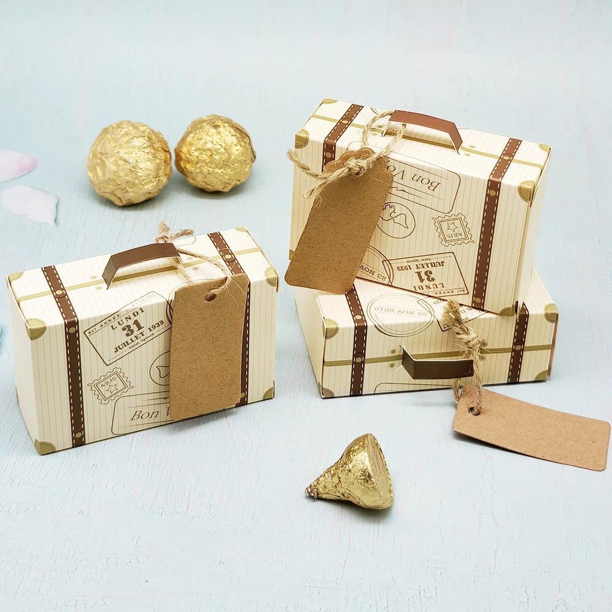 Add a touch of charm to your wedding or special event with our Suitcase Shaped Dessert Box. Perfect for wedding favors and party supplies, these adorable boxes are designed to resemble mini suitcases, making them a unique and memorable way to present small gifts or candies to your guests. Crafted from high-quality white cardboard and kraft paper, each box is sturdy and elegant, ensuring your gifts are both attractive and well-protected.
