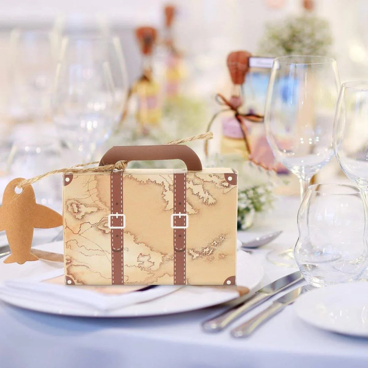 Vintage Charm for Your Events Add a touch of vintage charm to your events with these Suitcase Shaped Dessert Boxes. Perfect for wedding favours, party gifts, and festive decorations, these boxes feature a retro luggage design and a vintage travel map print. Ideal for travel-themed events, they provide a delightful way to present candies, chocolates, and small gifts to your guests.