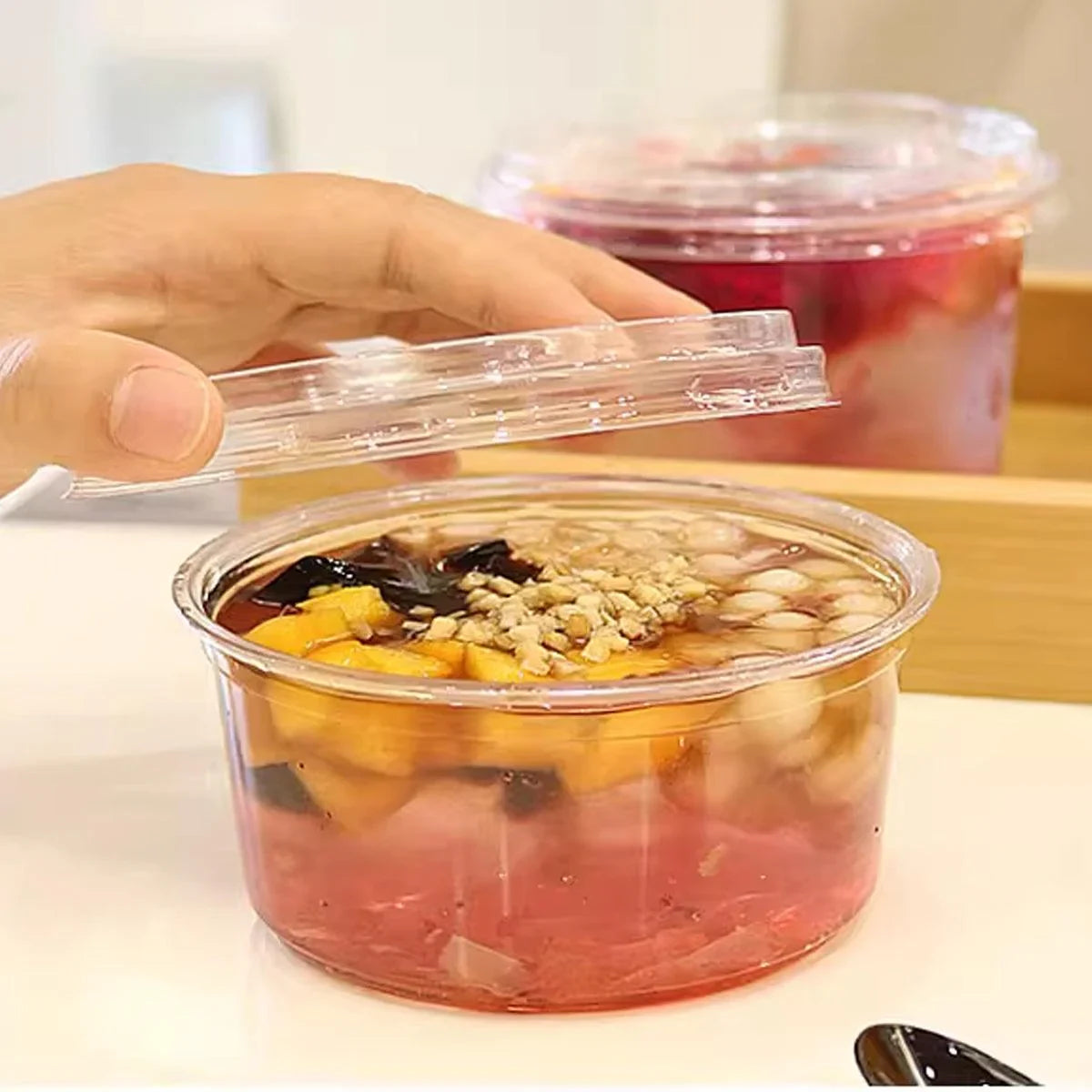 These transparent food-grade bowls with secure lids are ideal for packaging desserts, salads, snacks, and other food items. Made from high-quality PET material, they are lightweight, durable, and resistant to leaks and spills. The airtight lid design helps preserve freshness and prevents food from being exposed to air or moisture. With a clear appearance, these bowls enhance food presentation, making them perfect for bakeries, restaurants, catering, or home use. Designed for easy stacking and storage, these bowls are a convenient choice for takeout, meal prep, or party servings.