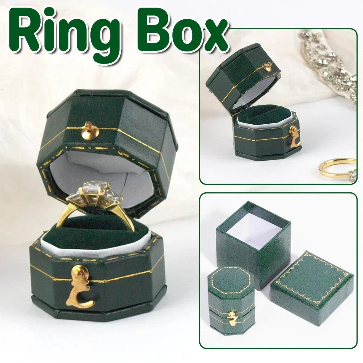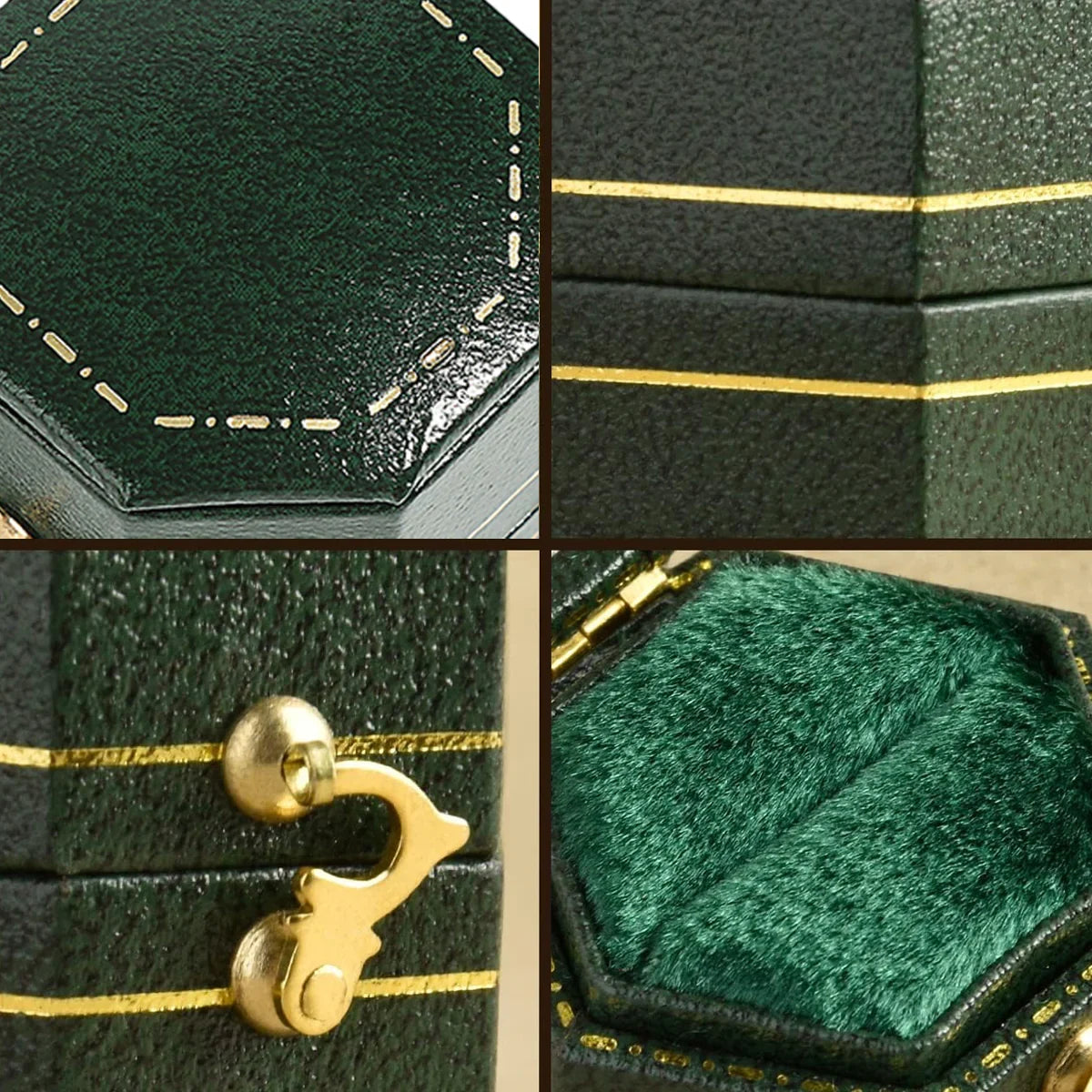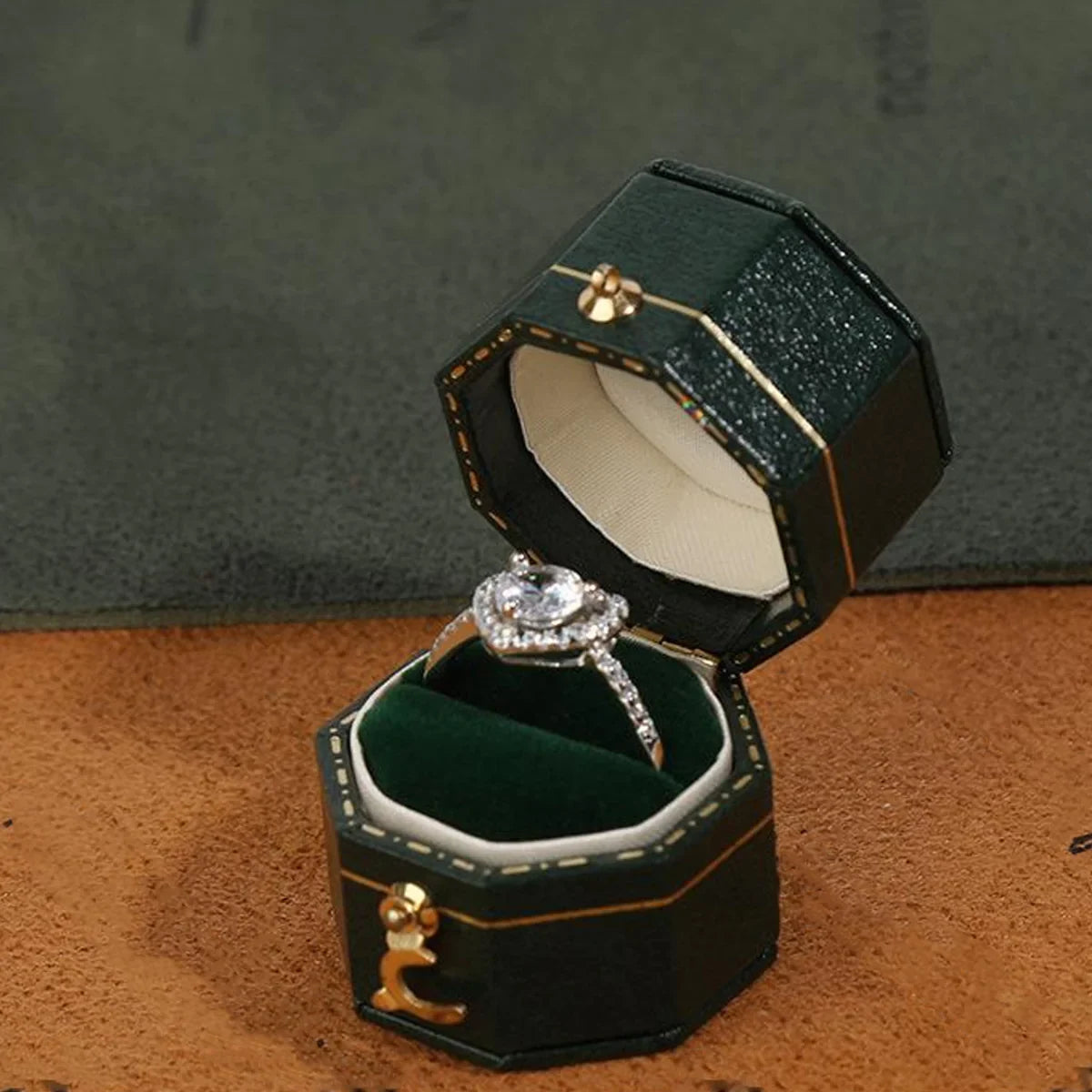Present your jewellery in style with this high-end octagonal ring box, featuring a luxurious vine green design. Made with premium imported leather paper and a soft satin interior, this box provides an elegant display for your rings or earrings. Its compact size of 1.18 x 1.37 inches is perfect for showcasing a single piece of jewellery, making it appear even more dazzling. The box also features a gold embossed design on the lid and a metal clasp for secure closure, offering both elegance and functionality.